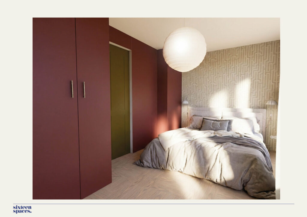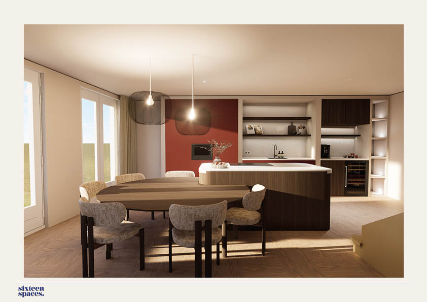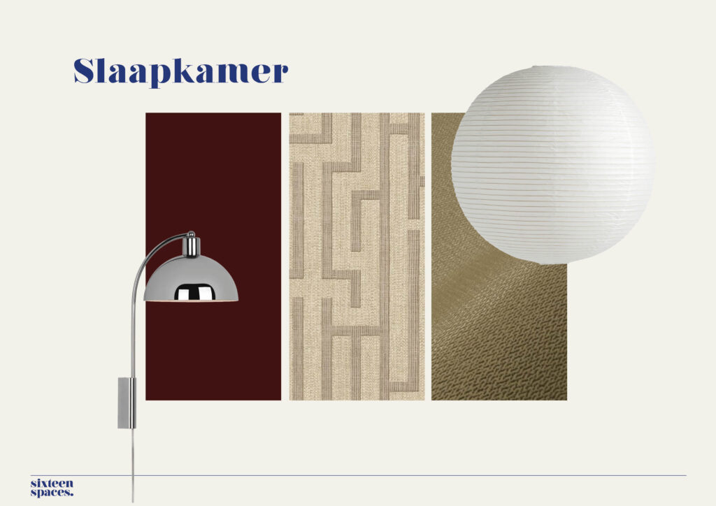 Het kleurenpalet bestaat uit bordeauxrood, lichtblauw en warme geel- en groentinten. Door deze kleuren in lagen terug te laten komen en te combineren met diverse materialen en texturen ontstaat een interieur met diepte en karakter. Subtiele retro-invloeden en rijke materialen zorgen samen voor een warm, levendig en uitnodigend geheel.
