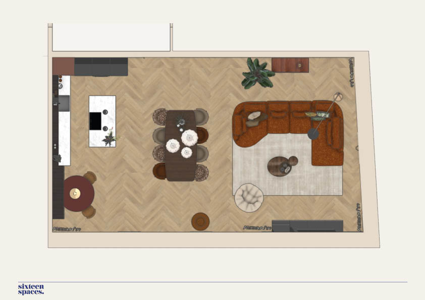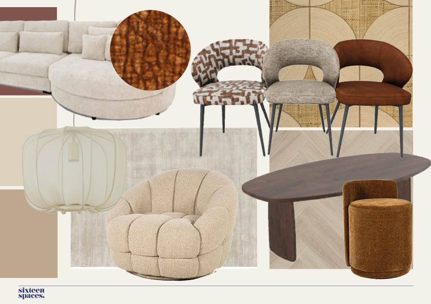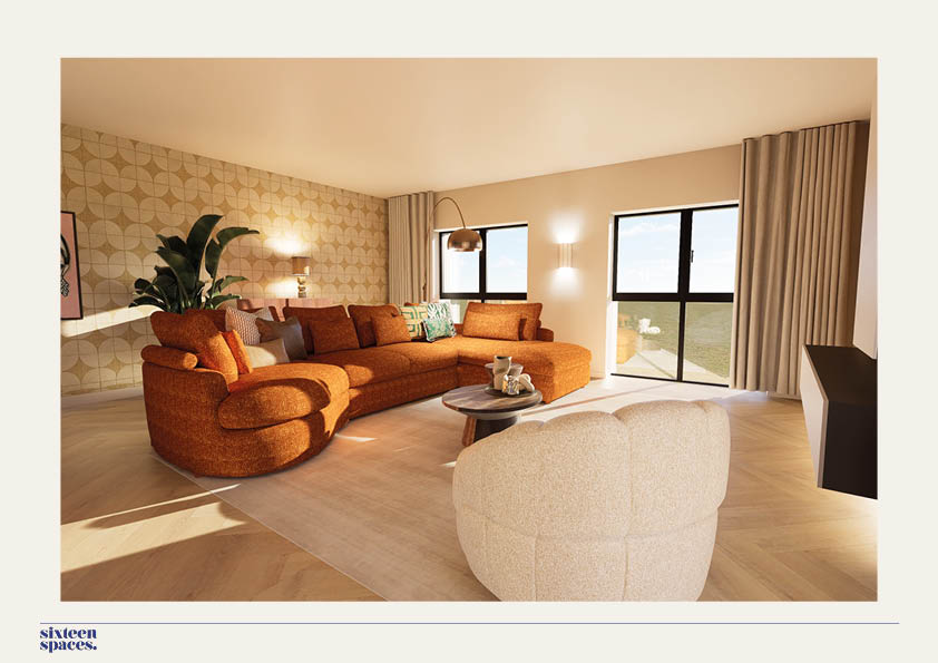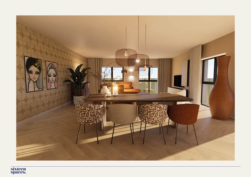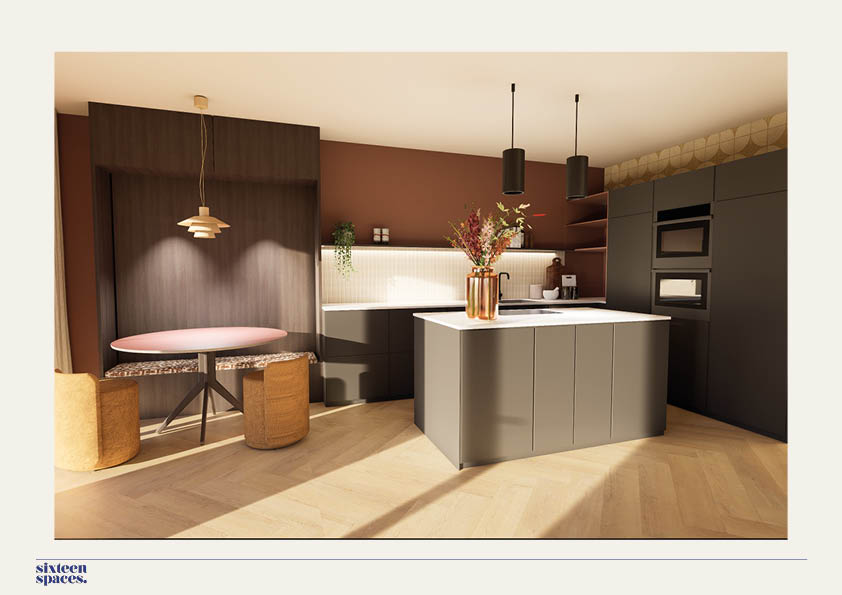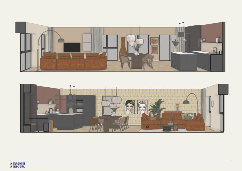 Behang met grafische prints brengt levendigheid in de ruimte, terwijl een palet van oranje- en bruintinten zorgt voor warmte en samenhang. De bestaande keuken kreeg bovendien een fijne upgrade door het toevoegen van nieuwe materialen, waardoor deze beter aansluit bij het vernieuwde interieur.